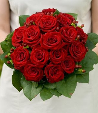 "A fabulous classic bouquet with a distinctive collar of glossy green foliage, sprigs of hypericum berries and deep red roses make a bouquet that would be perfect for a winter or Christmas wedding"